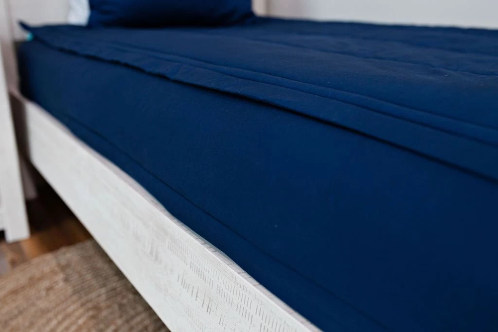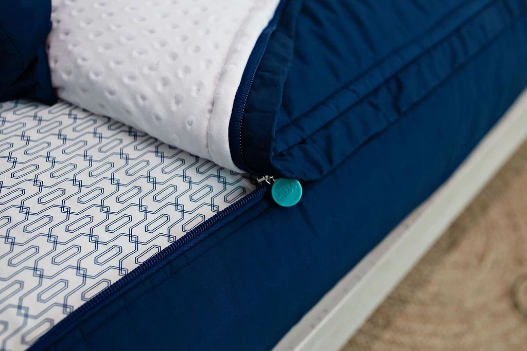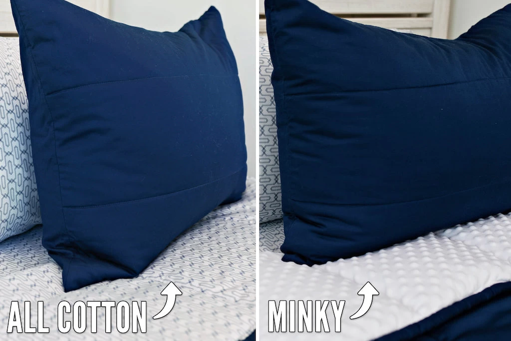 Minky option: Classic navy exterior fabric is 100% cotton, white interior minky is 100% polyester and navy and & white interior base sheet is 100% cotton.Â