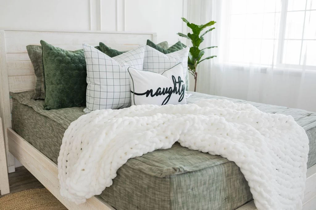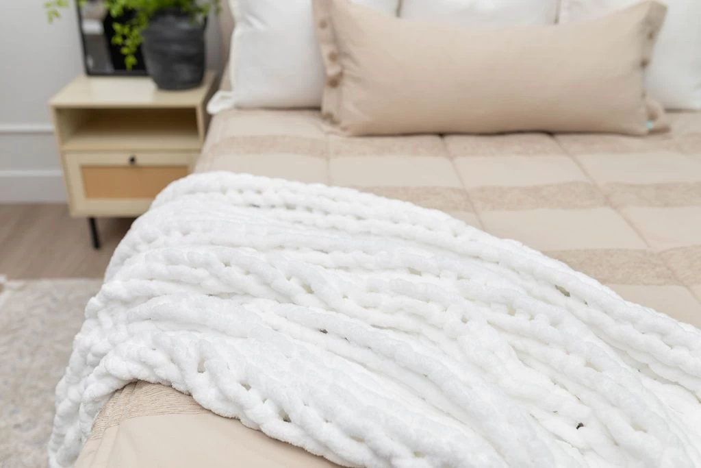 This classic white chunky knit blanket is a staple for cozy weather comfort. It’s the perfect addition to your bed, couch, or favorite chair this winter. Sweater weather just got better!