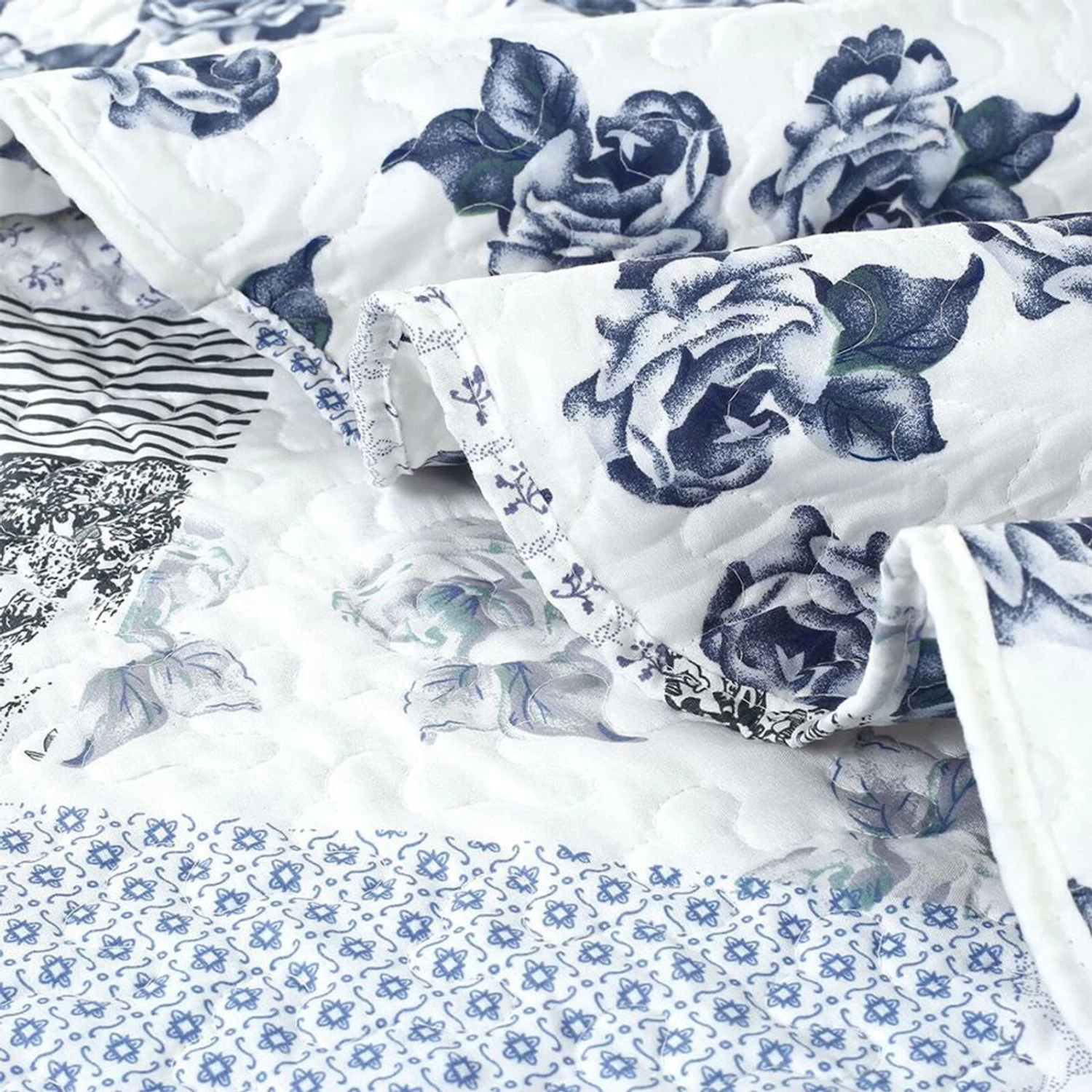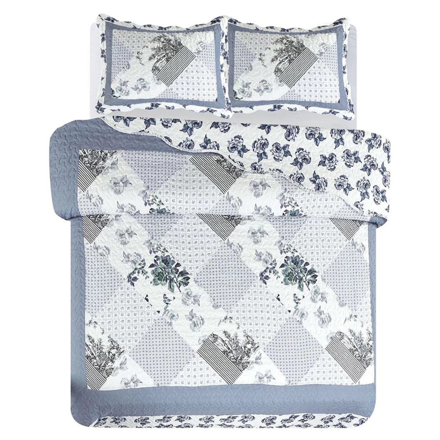 Legacy Decor 3 PCS Quilt Bedspread Coverlet Blue and White Floral Patchwork Design Microfiber King Size