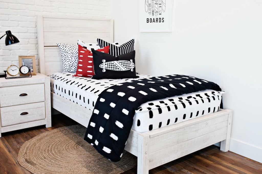 Double-sided black and white 100% cotton pillow cover measures approximately 22.5″ x 22.5″. Please note that this is a pillow cover and the insert is not included. But don’t worry, we got you. We offer the best feather pillow insert here.