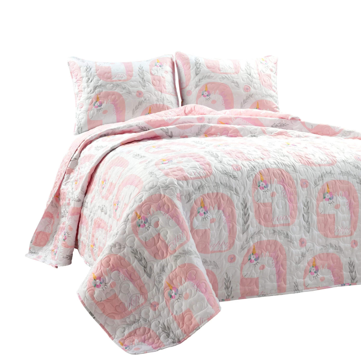 The more you look at this quilt, the more there is to love. The sweet smiling unicorns quickly brighten up your child’s bedroom and add cheerful style to the bedroom. Inspiring words such as “love”, “dream”, “happy” and “believe” decorate and capture the essence of this bedding. A sweet surprise is hidden in the unique swirling heart quilt stitching. The precious designs continue as you flip over the quilt and matching shams to reveal an adorable hand drawn heart pattern on the reverse. The complete quilt set includes 1 quilt and 1 matching sham. Sales of this quilt set support Make-A-Wish®. With every purchase, 5% of the wholesale cost is donated to Make-A-Wish America. This product is STANDARD 100 by OEKO-TEX® certified, which means the fabric, dyes and all components have been tested in an independent laboratory and certified against a list of more than 350 harmful substances. Please refer to label for full care instructions.