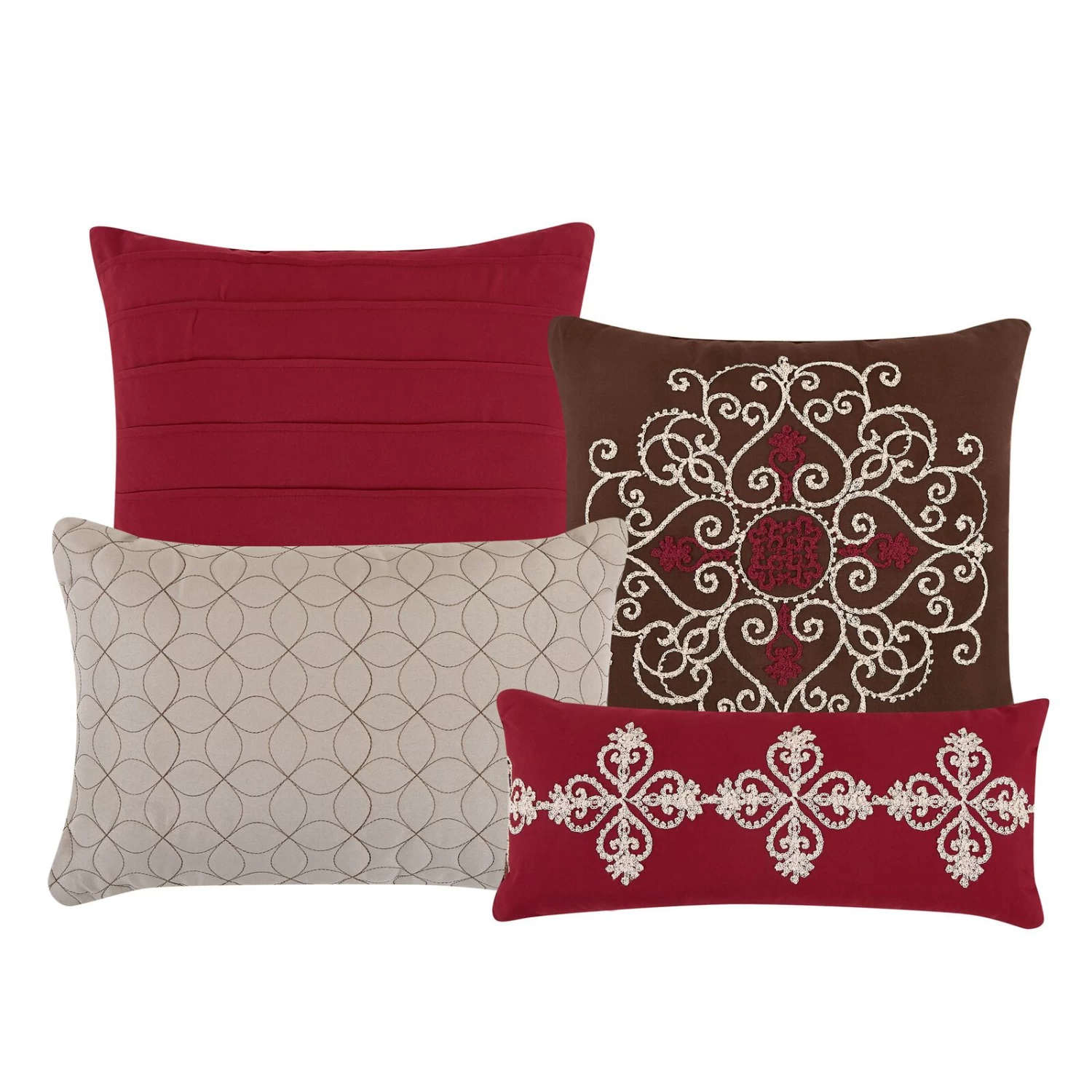 Queen: 1 comforter 90 by 90 Inches, 2 Shams 20 by 26 Inches, 1 cushion 16 by 16 inches, 1 cushion 18 by 18 inches, 1 Decorative pillow 10 by 20 inches, 1 breakfast pillow 12 by 18 inches