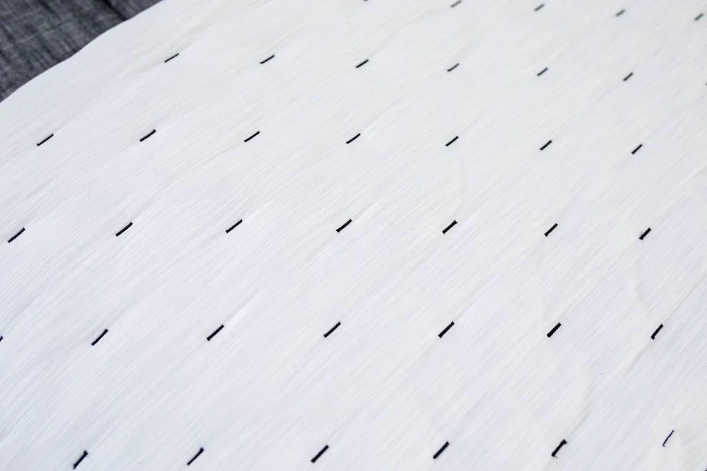 - Oliver features black embroidery and piping on a bright white woven background