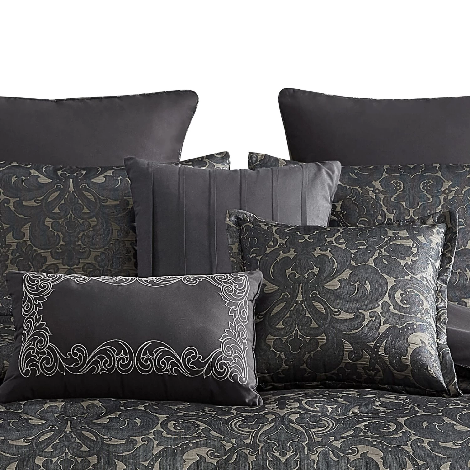 Pixie 10 Piece Polyester King Comforter Set, Damask Pattern, Charcoal Gray-Benzara