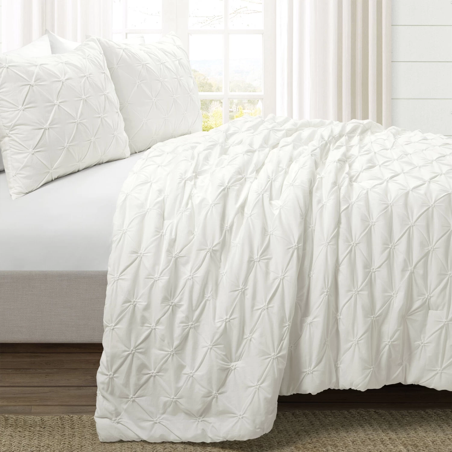 Relax in luxury with this three piece bedding set. This set includes a cozy comforter and two matching pillow shams, all made of 100% cotton for soft and warm coverage you can enjoy in any season. The tucked detailing on the comforter keeps your bedding filling in place and adds a lovely texture to this look. The shams have a standard envelope opening to easily insert your pillow. This bedding set is machine washable for your convenience.