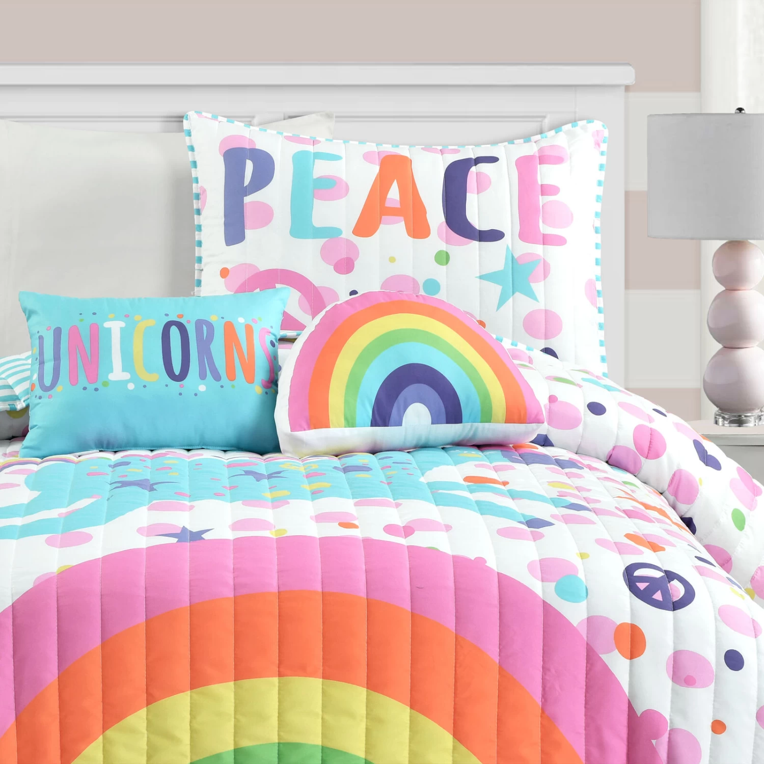 Peace, love, unicorns and rainbows. You get it all with this bright, bold and colorful reversible quilt set for your child’s bedroom makeover. The front design also includes hearts, stars and circles to brighten the space and your child’s mood.