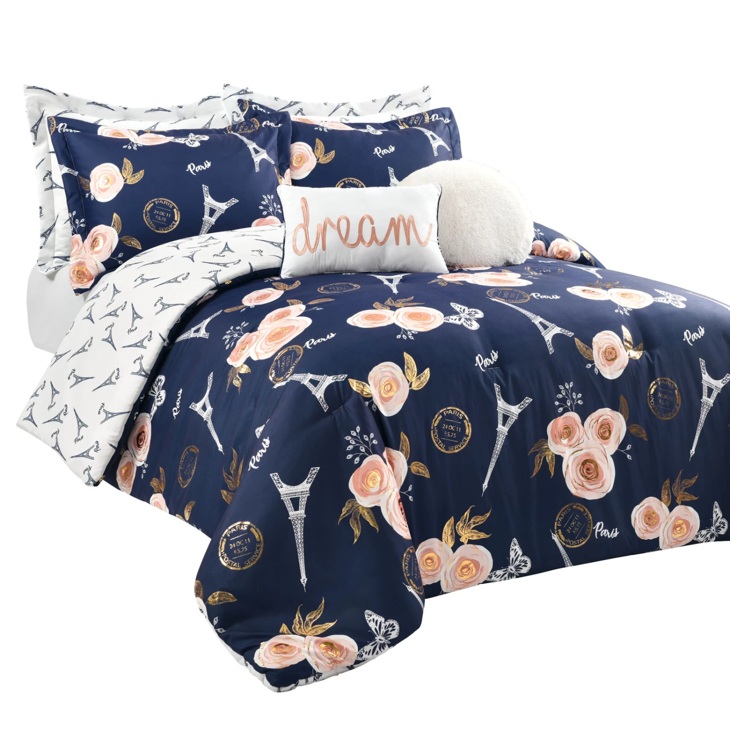 You will love this soft reversible comforter set featuring a unique and elegant pattern of roses, butterflies and Eiffel Towers with the word Paris in script font. The lovely vintage design with modern metallic printing detail will take your breath away.