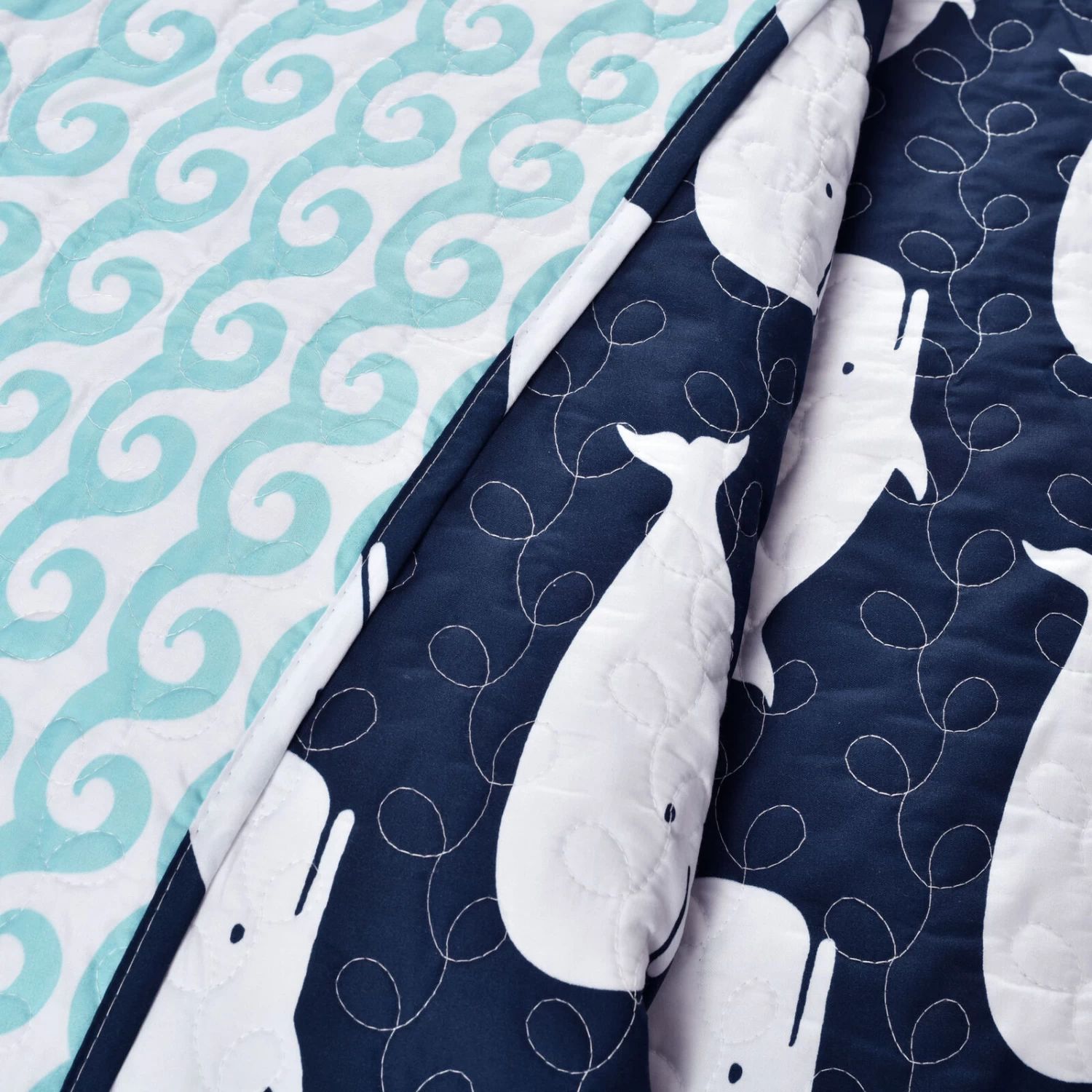 Let the kid inside come alive with this playful whale quilt set with two fun matching decorative pillows. Perfect addition to any bedroom. Made from Micro Fiber. Part of the Whale collection.
